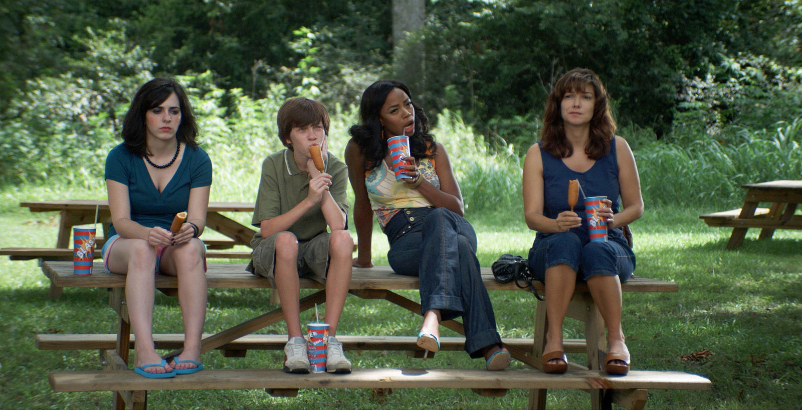 Tabby (Ashley Duggan Smith), Little Pete (Christopher Newhouse), Imogene (Jill Marie Jones), and Anora (Laura Harring) eat corn dogs.